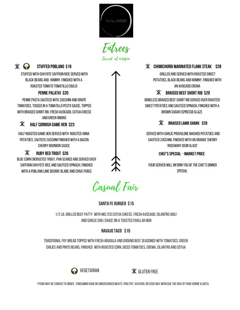 Welcome to Salado, an American bar located in the heart of Fairplay, Colorado. Offering a delightful blend of Southwestern flavors, Salado's menu is a feast for the senses. The standout dish, the Braised Short Rib, has garnered rave reviews for its tenderness and rich flavor, resulting from 18 hours of braising. Customers praise the Jicama Orange Salad and Asparagus Bisque for their refreshing and comforting qualities, making them perfect starters.